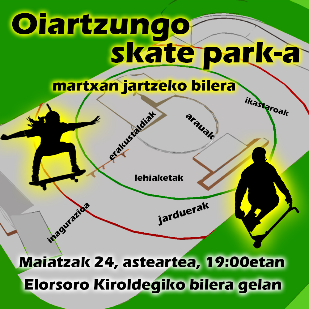 Ikusten duzuenez Oiartzungo Skate Park-a bukatzen ari dira eta egun gutxi barru martxan jarri nahi dugu. Martxan jartzeko zuen ideiak, proposamenak etab behar ditugu, beraz interesatuak zaudeten guztiei bilera hontara etortzeko deialdia egiten dizuegu: